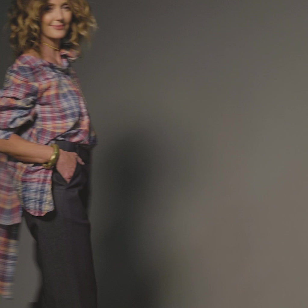 A full, flowing top designed with side panels and asymmetrical seam detailing for soft movement and modern shape. Finished with a statement pussy-bow removable tie and full sleeves, it offers versatile styling — wear it elevated with high-waisted pants or relaxed and undone at the neck for an effortless, loose silhouette.